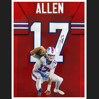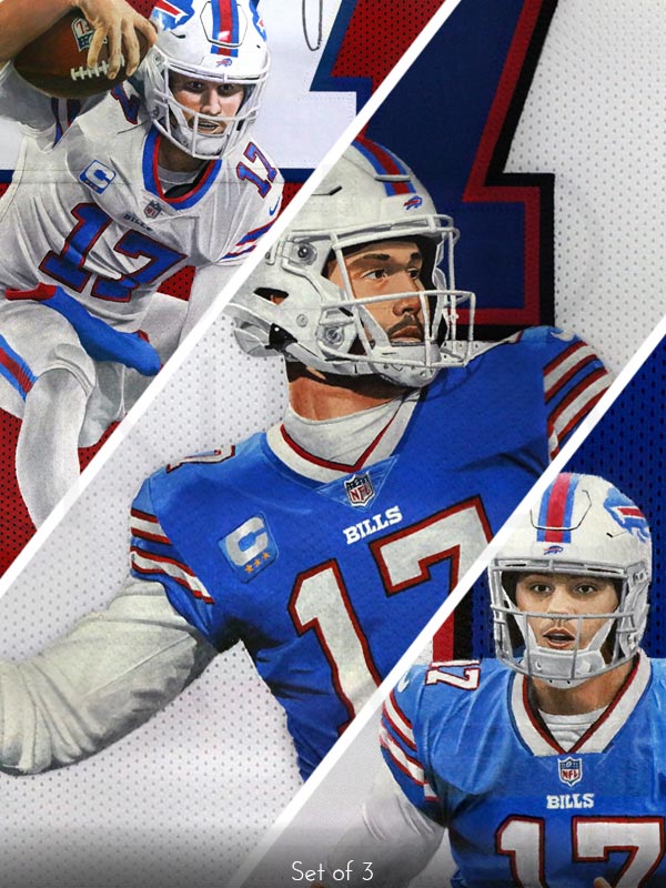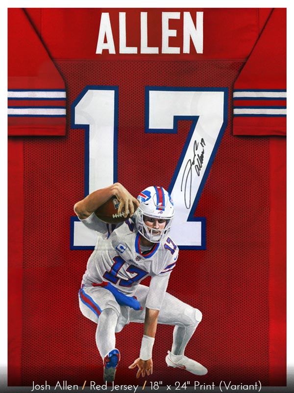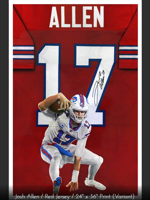 These giclée prints are printed on matte paper. The set includes the three (3) red, white, and blue Josh Allen jersey painting prints with options for normal or printed autograph variations available in 18" x 24" or 24" x 36" sizes.