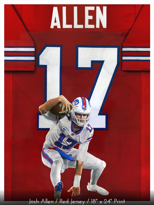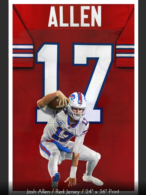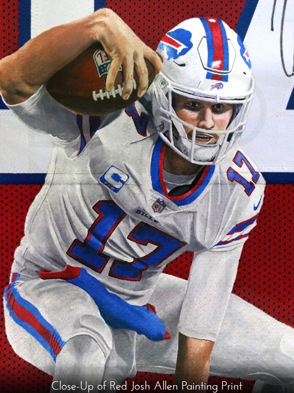 Josh Allen is amazing! The red, white, and blue Josh Allen jersey painting series is now available in prints with or without the printed Josh Allen signature. Available in two different sizes: 18" x 24" or 24" x 36". It's the perfect gift for any Bills Mafia or Buffalo Bills fan! Go Bills!
