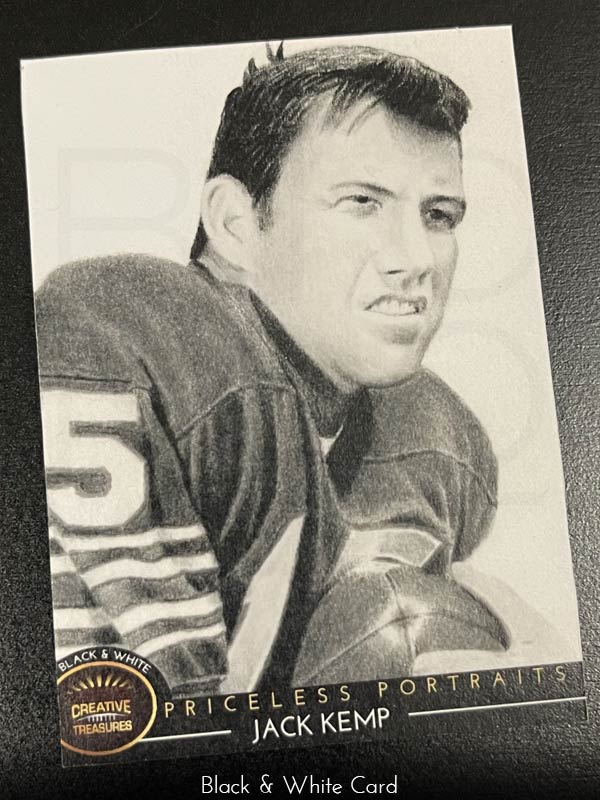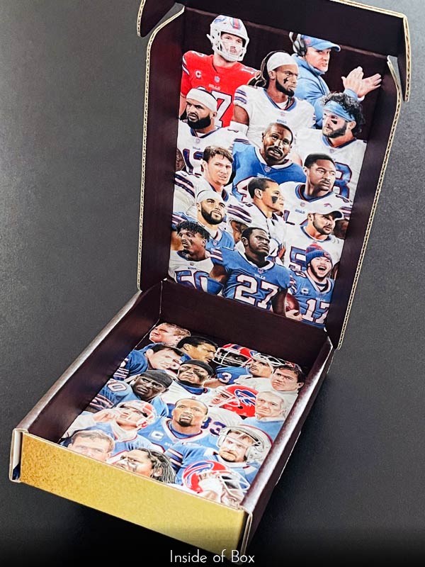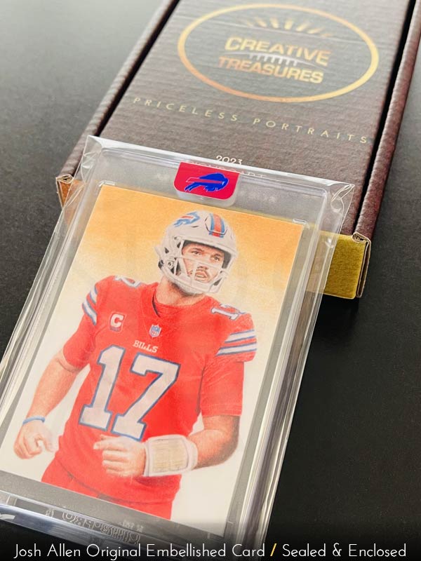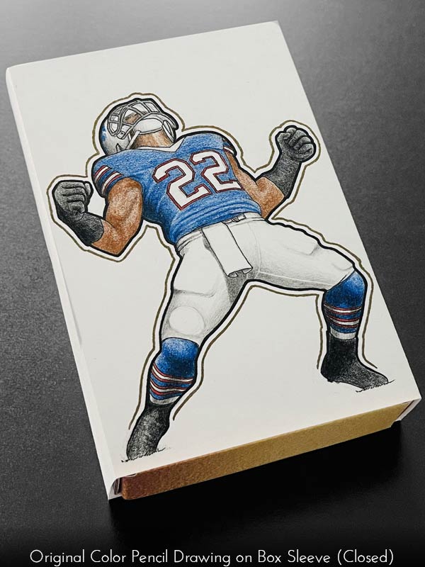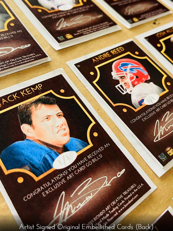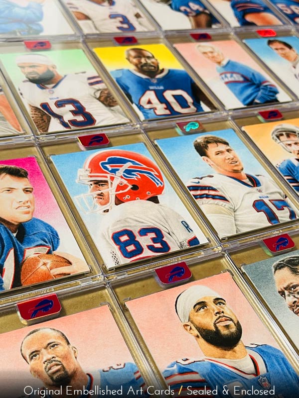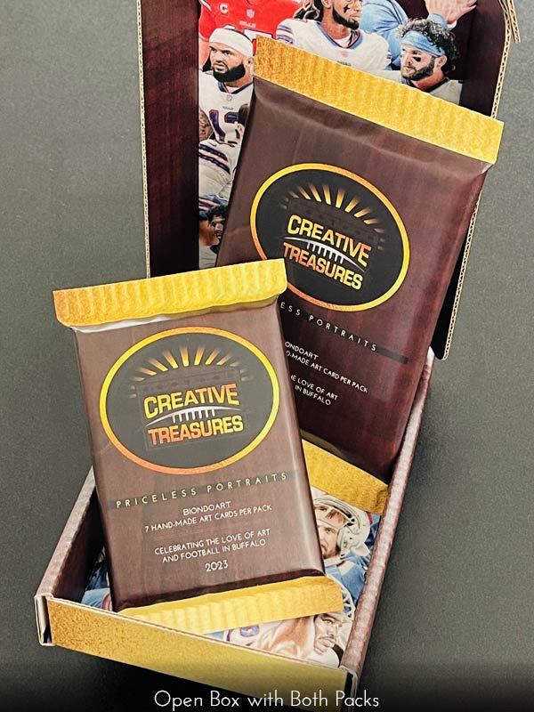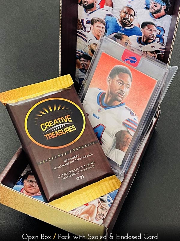 Each box contains 2 packs featuring 8 limited edition hand-made art cards. One pack contains 7 random limited edition cards in soft plastic sleeves, and the other pack contains 1 original embellished art card signed by the artist, Michael Biondo, in a sealed clear plastic case. Also, each box is presented with an open ended sleeve enclosure featuring an original color pencil and ink drawing (approximately 4" x 6") of current and legendary Buffalo football players.